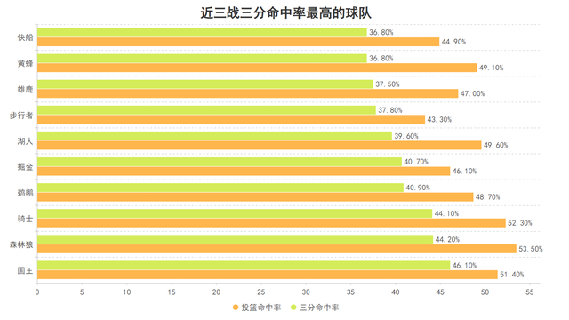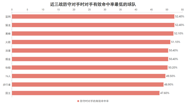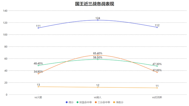 近三战国王防守对手时,对手的运动战也就是结合三分情况的有效命中率仅有47.6%,这个防守时限制对手命中率的效果位于联盟最强,当国王能把球命中时会激发球员们的积极性更加卖力的防守,同时也可以令对手难以打出攻防转换的得分机会,由进攻带动防守是国王近三战强势的关键。