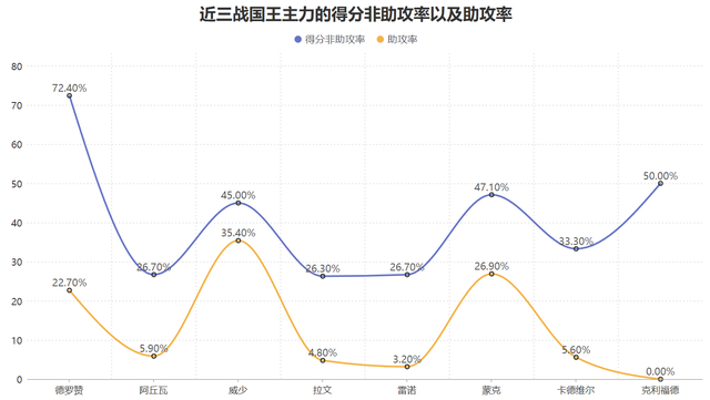 近三战德罗赞、威少与蒙克的得分非助攻率均超过了40%,同时三人的助攻率也相对更高,这意味着近三战三人都拥有较多的自主持球单打的得分并且队友的主要得分也来源于此三人,因此三人都具备得分+助攻攻传一体的能力,威少主持球、德罗赞与蒙克副持球的多核发动令对手难以限制。