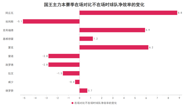 有人欢喜有人愁,国王的连胜令教练重新信任蒙克也必定给予威少更多处理球的机会,如此一来可以出战的施罗德就显得较为尴尬了,目前为止施罗德在场对比不在场时,国王的净效率会从负9.2下降到负12,这意味着施罗德的在场会令国王每百回合的净负分负上加负,和近三战的主力相比也是在场时每百回合净负分最多的球员,更重要的是他还和现有的后卫线球员位置冲突,施罗德尽管可以出战了但国王只要想赢就很可能会被弃用。